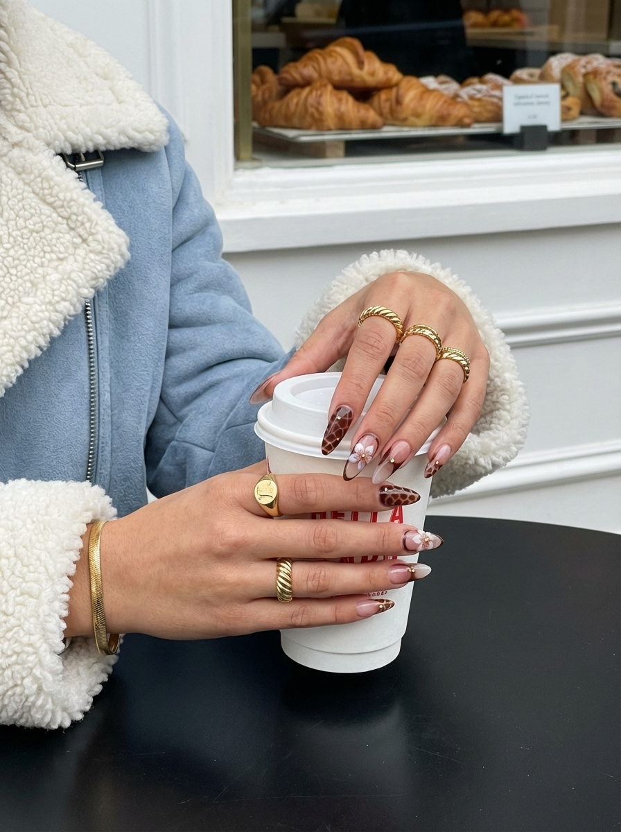Une pose originale mêlant une base nude élégante, des touches léopard, un bordeaux profond et de délicates fleurs.