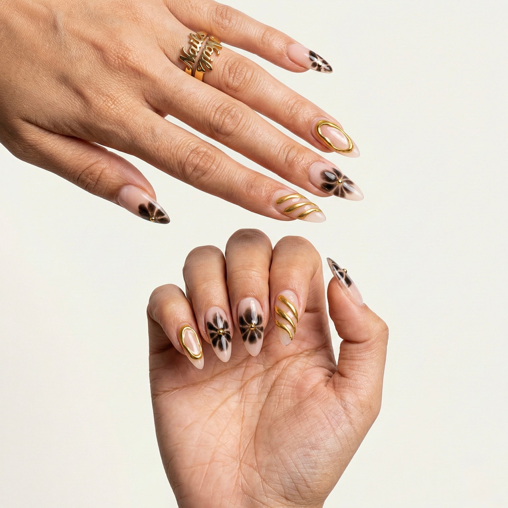 Un nail art sophistiqué mêlant nude translucide, motifs léopard et détails dorés en relief. Les lignes or apportent une touche bijou ultra élégante, tandis que le léopard ajoute du caractère et une note sauvage maîtrisée.